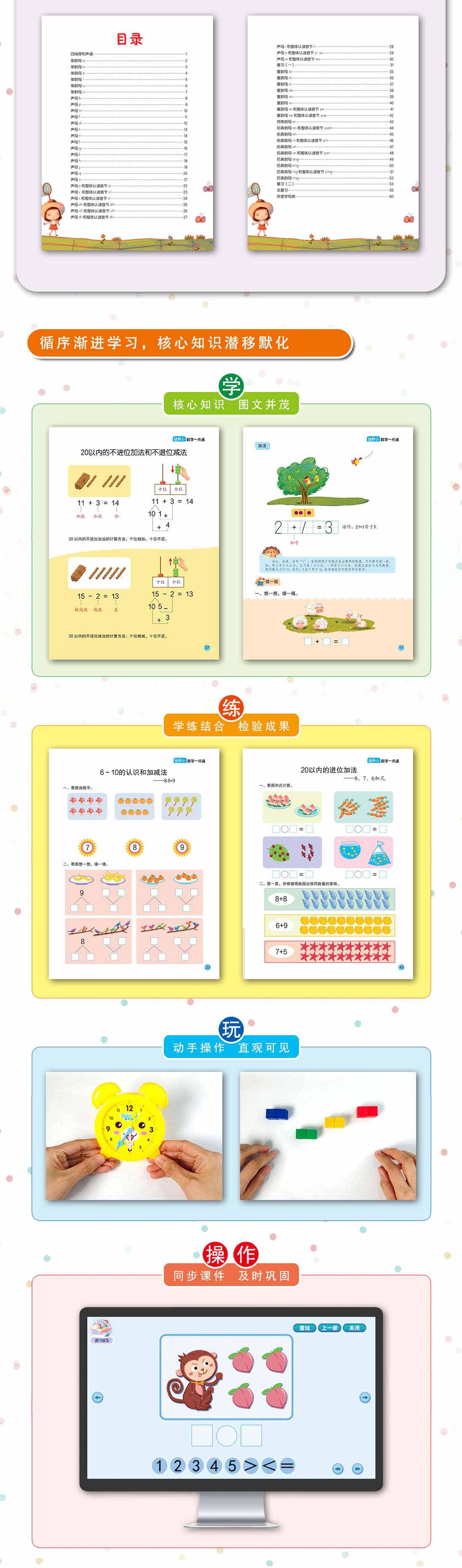 幼升小一点通,针对孩子的学习需求进行科学设计,随书配有拼读卡片、计算卡片和各种操作材料,借助生动的画面和丰富的练习形式,将知识性与趣味性相结合,针对幼儿学习特点,提供全面的学习内容,让孩子在游戏中成长,在快乐中掌握知识,培养孩子良好的学习习惯,为未来的学习之路打下坚实的基础。